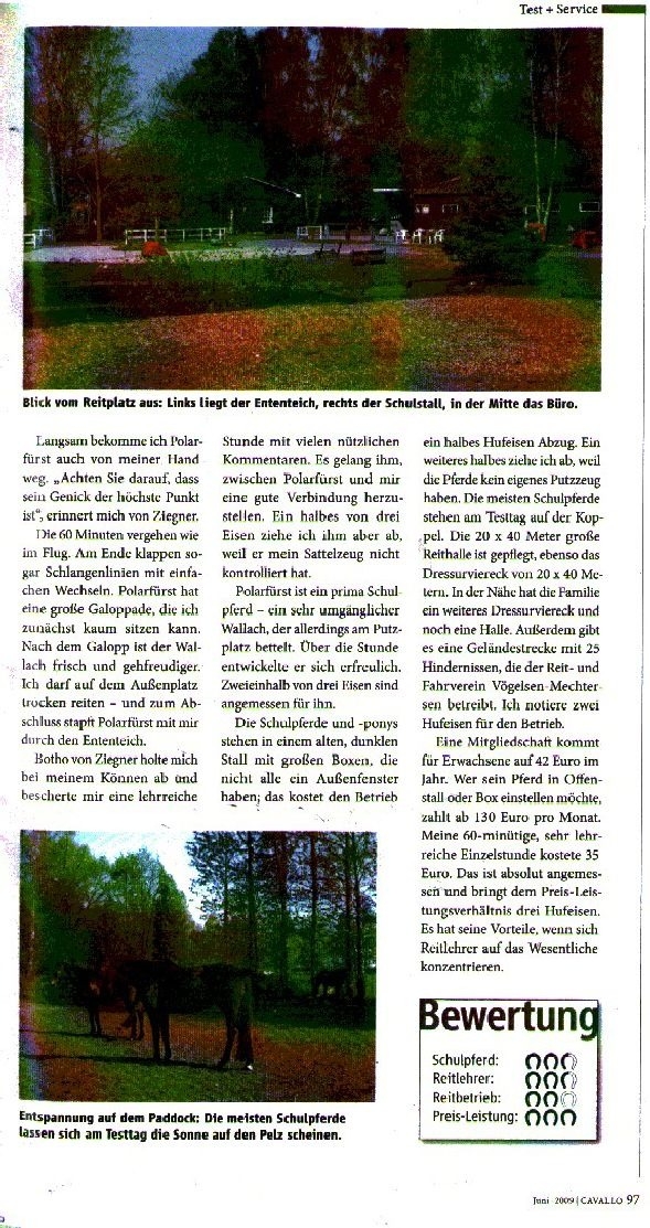 Nach 2 Jahren Reitpause suchte ich nach einem geeigneten Reitlehrer. Da ich Späteinsteigerin war (mit 43 Jahren das erste Mal auf einem Pferd) fiel mir die Auswahl nicht gerade leicht. Vor vier Wochen bekam ich dann von einer Bekannten den Tipp, Botho von Ziegner einmal anzurufen und zu erfragen, ob er für mich Zeit hätte. Dieses tat ich dann auch und hatte vor drei Wochen meine erste Reitstunde. Diese war insofern schon gleich sehr lehrreich, weil Herr von Ziegner mir erklärte, dass das Reiten nur mit einem lockeren Fußgelenk klappen würde. Zudem belastete ich irrtümlicherweise die Steigbügel mehr auf den äußeren Fußballen. Um einen guten Knieschluß am Sattel zu haben, müßte ich eben vermehrt auf den inneren Ballen reiten. Mein Sitz wurde dadurch gleich viel besser und ich hatte ein Erfolgserlebnis.